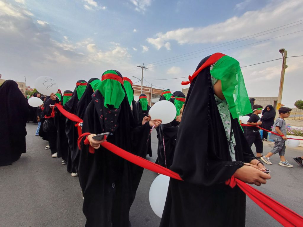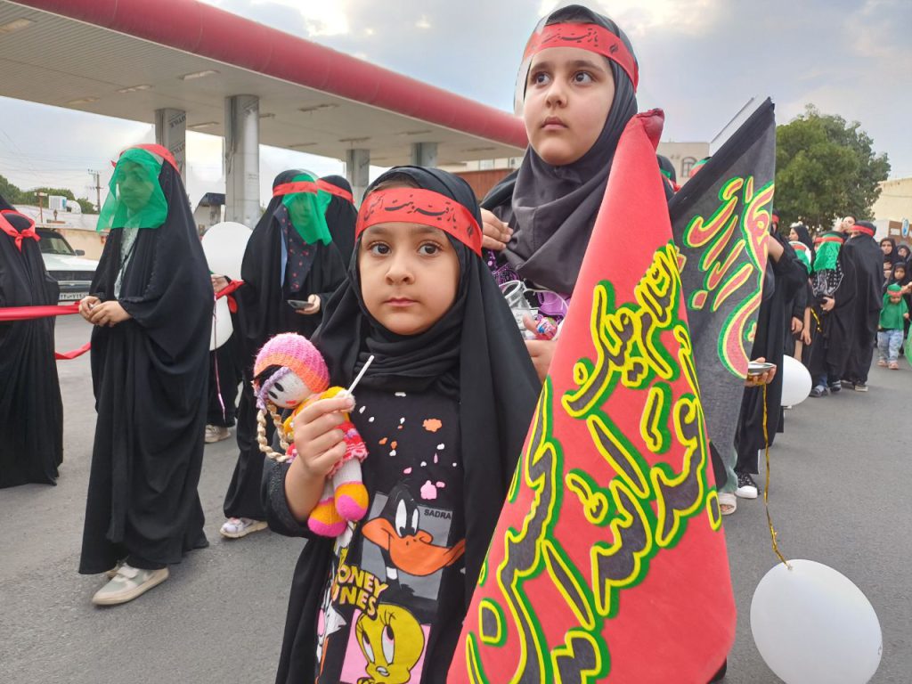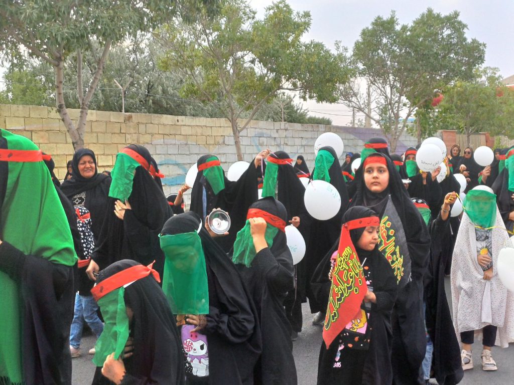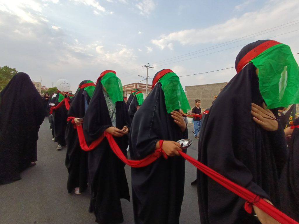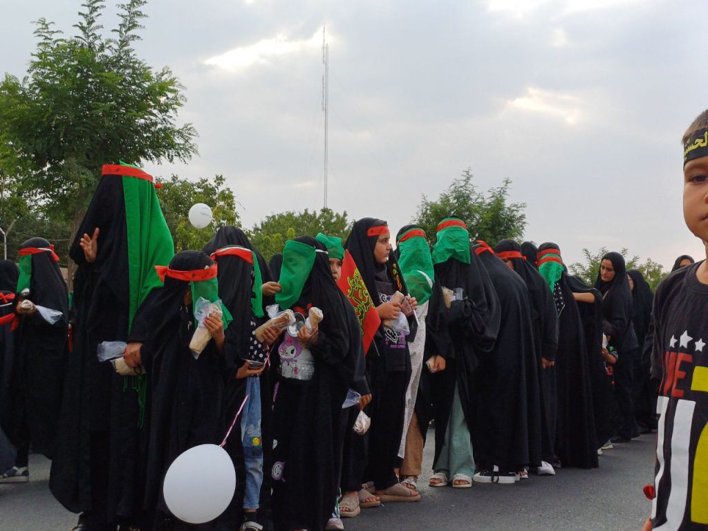 کودکان با پوشش لباسهای مشکی و چادرهای عزا، در حالی که با سربندهای یا حضرت رقیه(س) صفبسته به سوی محل مراسم حرکت کردند و به یاد اسرای کربلا، صحنههایی تأثربرانگیز خلق کردند.