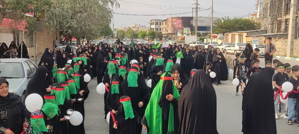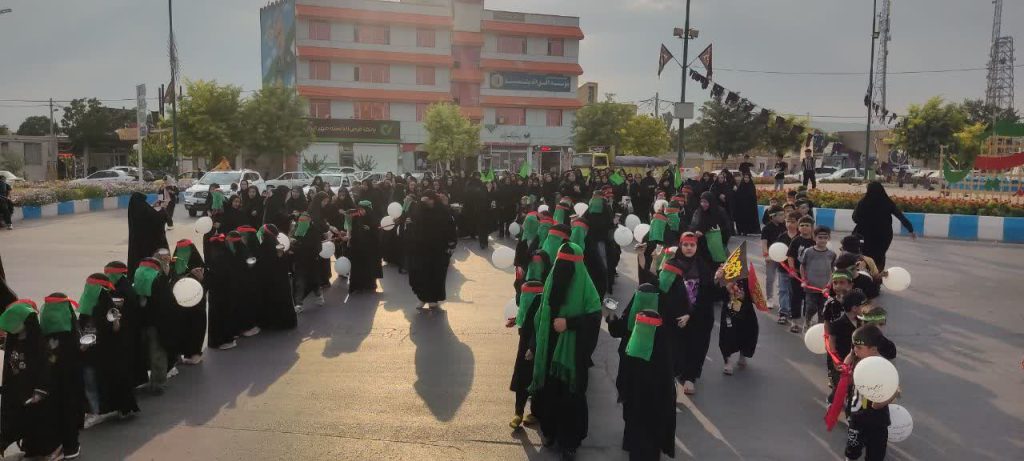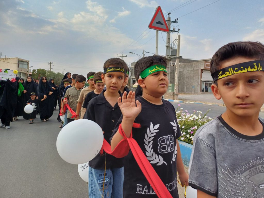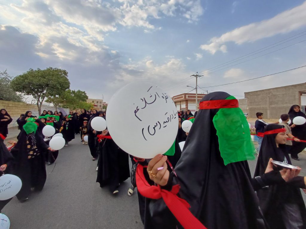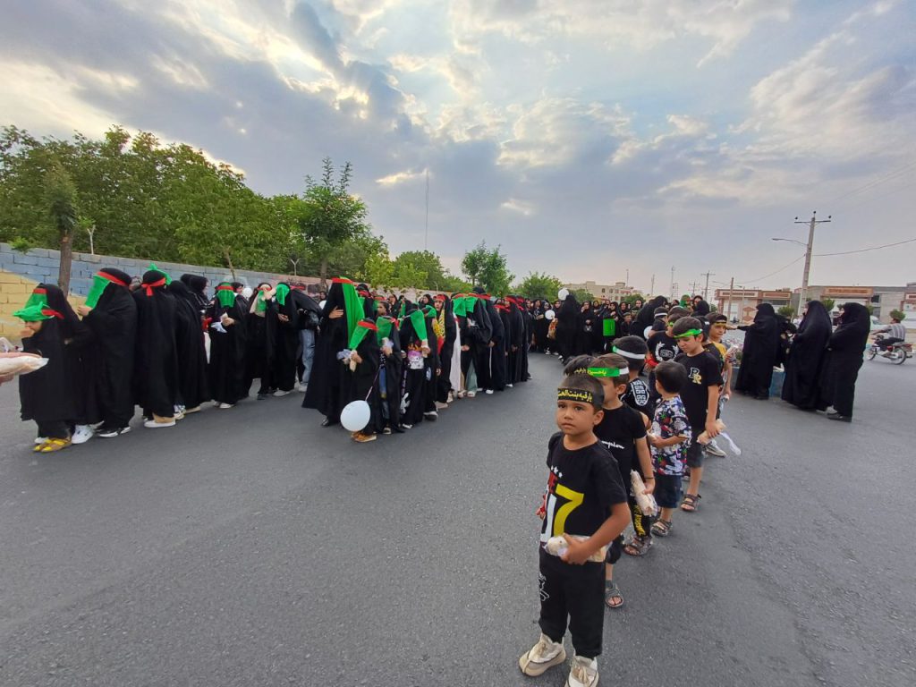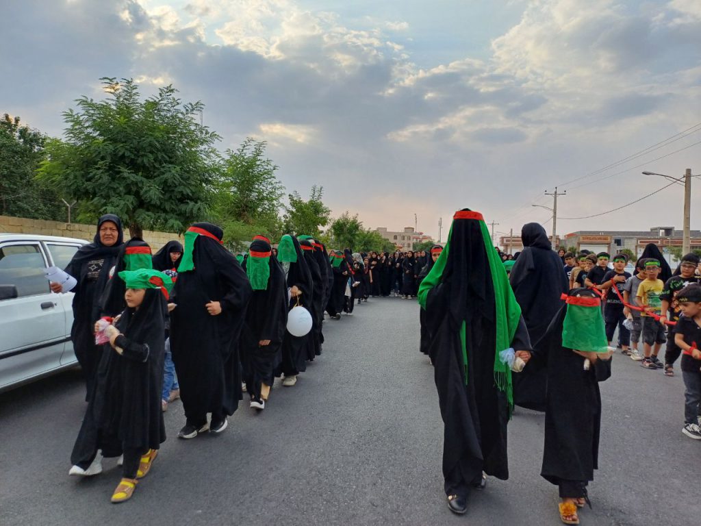 مراسمی که با حضور دهها دختر خردسال در سنین ۳ تا ۷ سال، فضای شهر را عطرآگین از عشق به حضرت رقیه(س) کرد.کودکان با پوشش لباسهای مشکی و چادرهای عزا، در حالی که با سربندهای یا حضرت رقیه(س) صفبسته به سوی محل مراسم حرکت کردند و به یاد اسرای کربلا صحنههایی تأثربرانگیز خلق کردند.